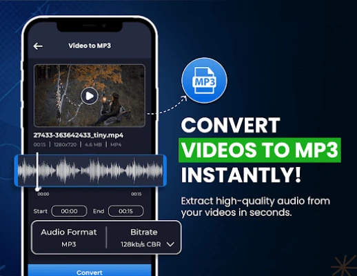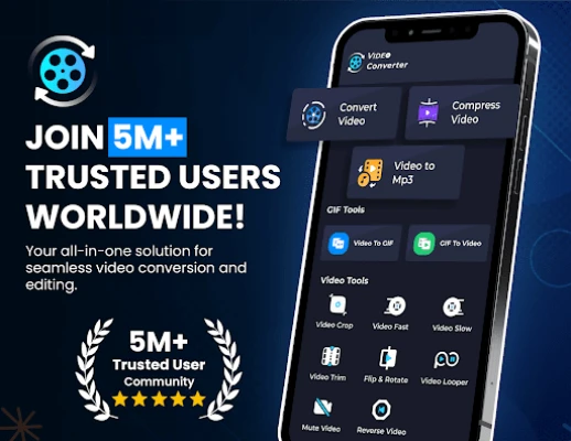 🌟Join the 5M+ users community transforming their videos effortlessly with Our Video Converter App🎥! Unlock Powerful features like Video to MP3, GIF Maker, Trimming Videos, Convert MP4 to MP3, Cut Video and Audio, Merge Music, Reverse Video to Audio and Video Editor — all in one app. Experience Fast, Secure and reliable Video Converter & Video Compressor trusted by millions worldwide.
