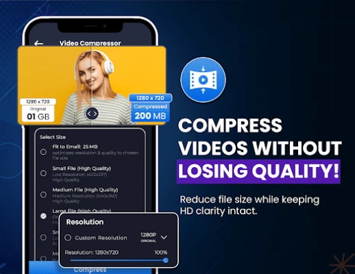 Compress Video effortlessly without losing quality with Video Compressor! Save storage space, share videos faster, and customize file sizes with ease. Perfect for all your sharing needs.